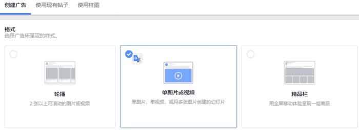 廣告格式有三種,默認選擇單圖片或視頻,格式在整個廣告里的重要性大概占80%