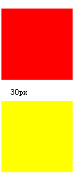 兩個層都設置為100寬 100高。第一個層背景色為紅色,下邊界(margin-bottom)為20 px.。第一個層背景色為黃色,上邊界(margin-top)為30 px.。那么這兩個層之間的距離是不是20+30=50px呢?其實不然,他們之間的距離應是他們邊界中最大一個值,也就是30px。效果如圖:
