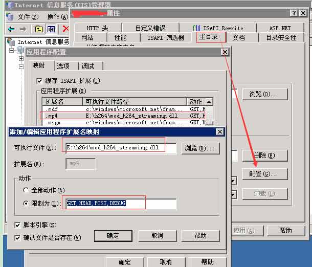 4、在需要開通視頻拖放功能的主機上右鍵-屬性-主目錄-配置-添加擴展名為“.mp4”,可執行文件為mod_h264_streaming.dll,動作限制為:GET,HEAD,POST,DEBUG。