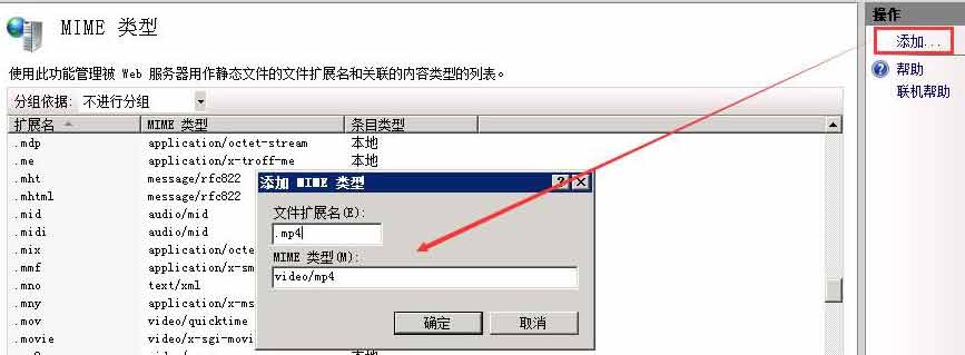 3、打開“Internet 信息服務(IIS)管理器”,點擊計算機名,切換到功能視圖,選擇“MIME類型”->添加 文件擴展名“.mp4”,MIMIE類型“video/mp4”。