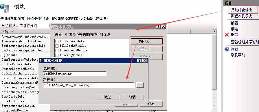 4、返回計算機“功能視圖“,選擇“模塊”->"添加托管模塊"->"注冊" 名稱填入:“ModH264Streaming”,路徑選擇mod_h264_streaming.dll所在路徑。